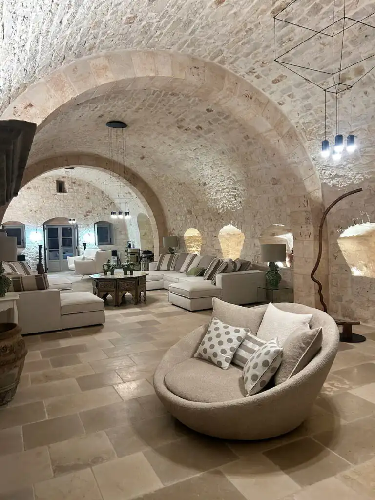 Con la consulenza di Gobbo Salotti sono state scelte linee morbide e colori delicati, in armonia con le nuance della pietra e del tufo, per dare vita a un ambiente rilassante dove riconnettersi con la terra e con la natura.