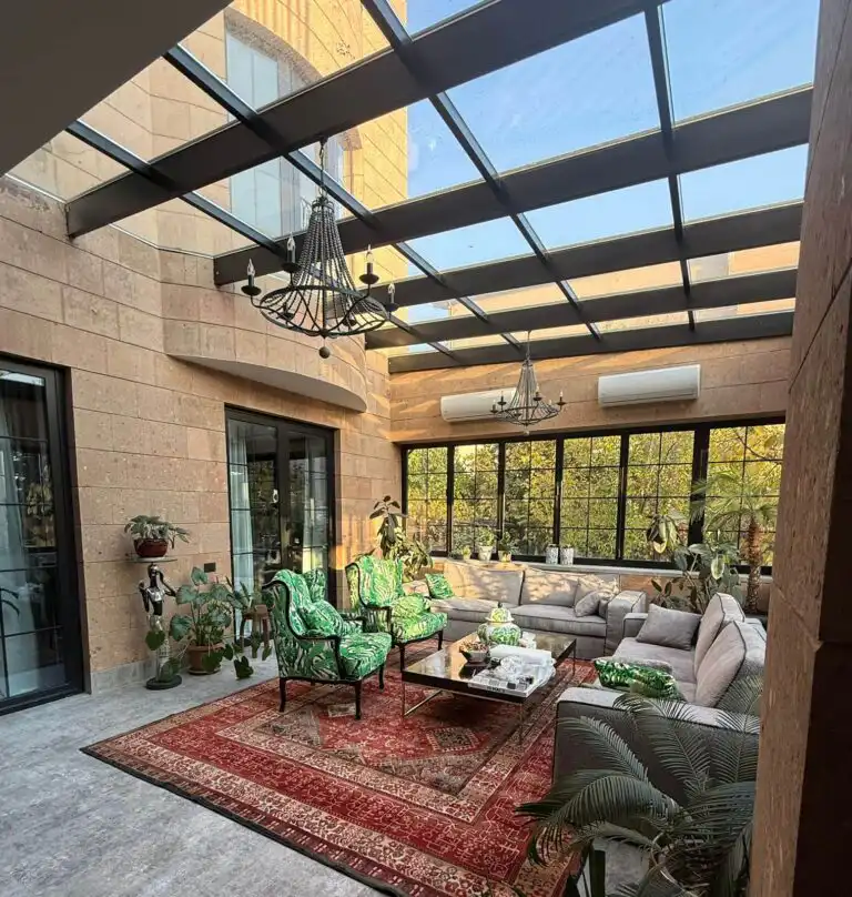 Nel luminoso giardino d’inverno della villa, caratterizzato da ampie vetrate in ferro nero e affacci sul verde, il progetto degli imbottiti è stato studiato per creare…
