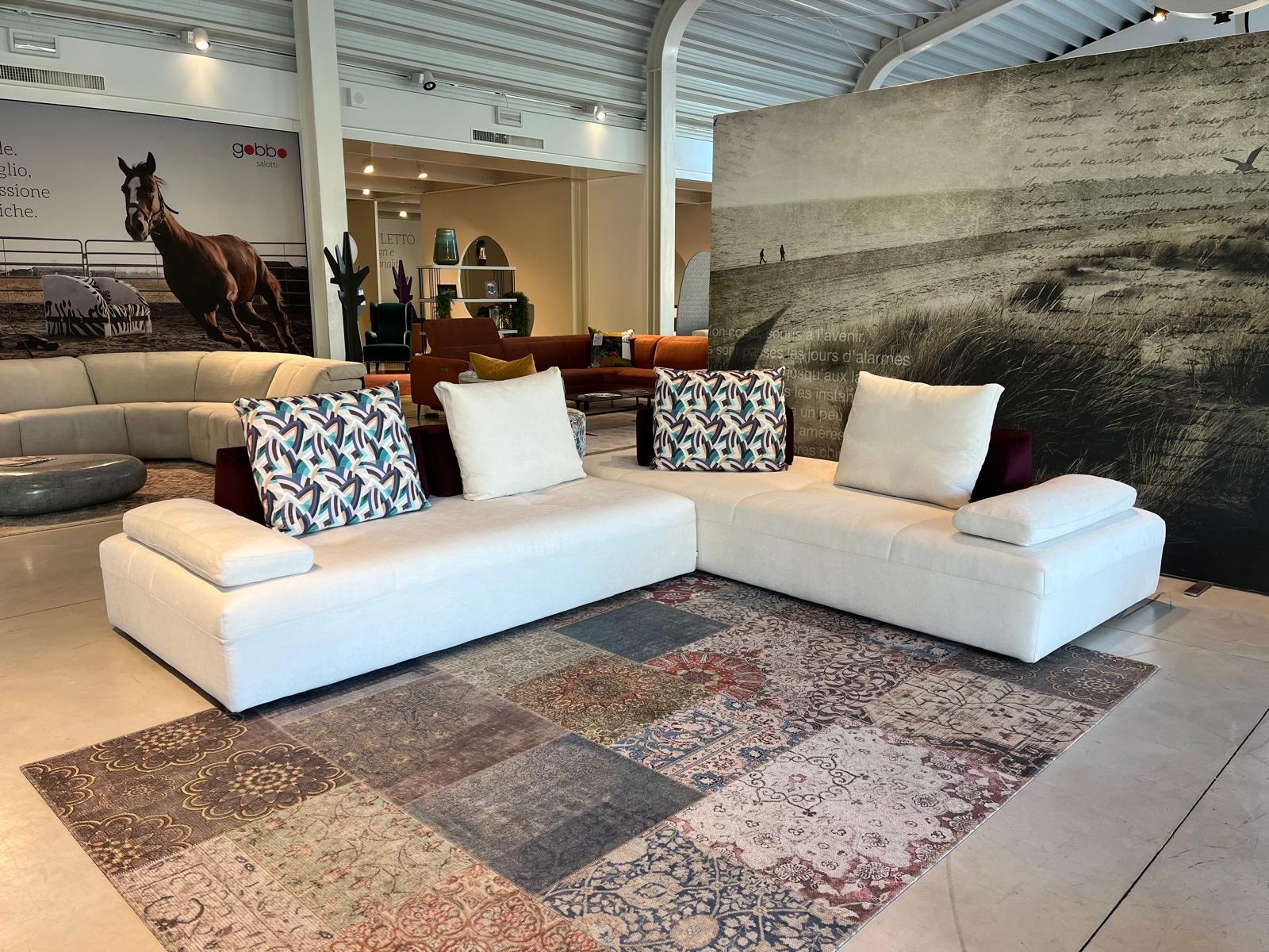 Divano Maddy da 289×95 cm rivestito in tessuto lavabile antimacchia. Visibile nel negozio di Treviso.