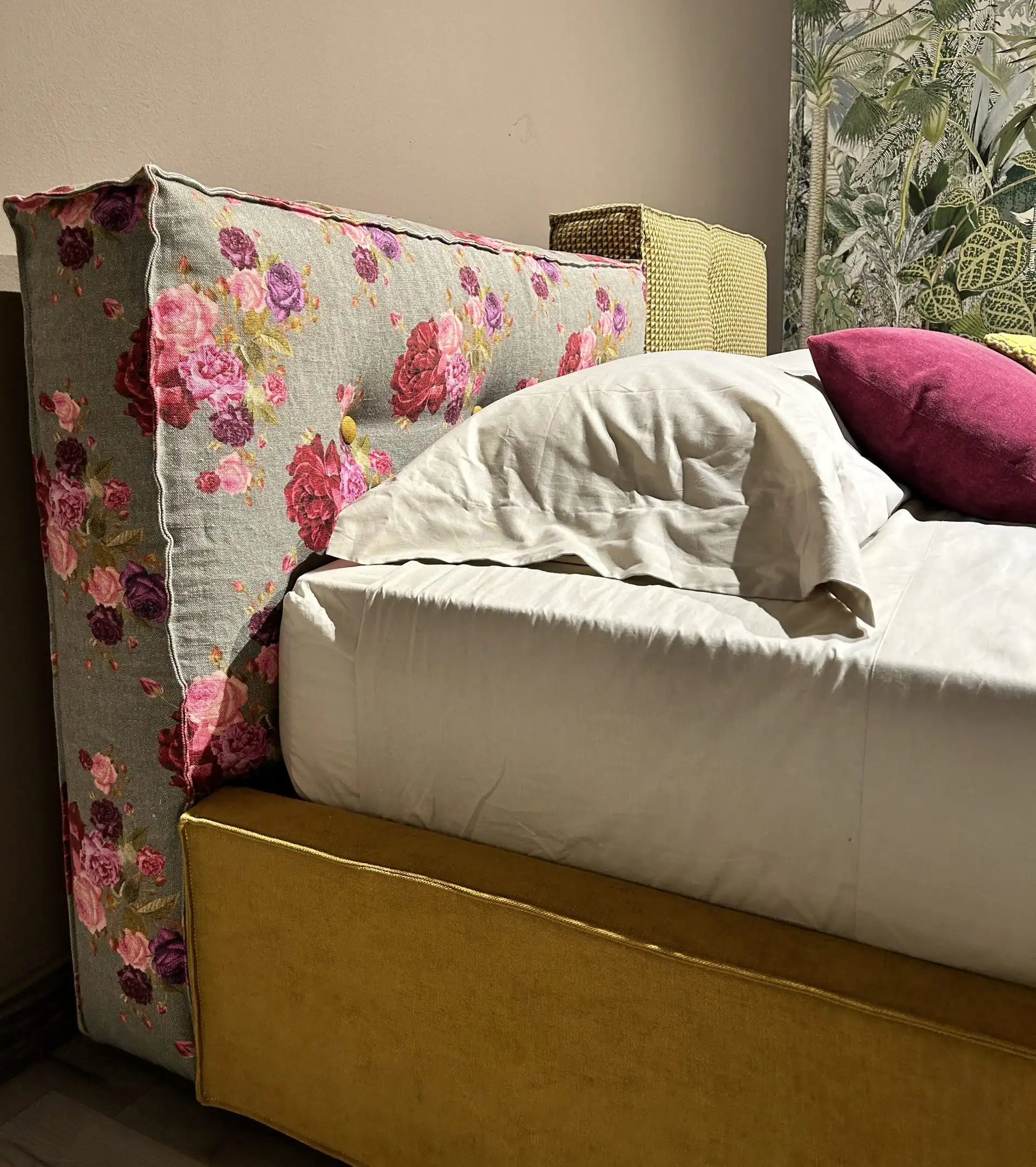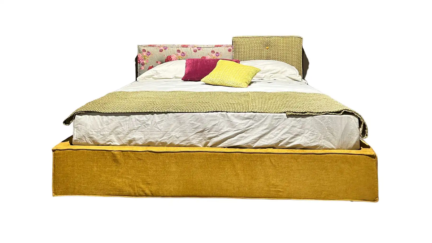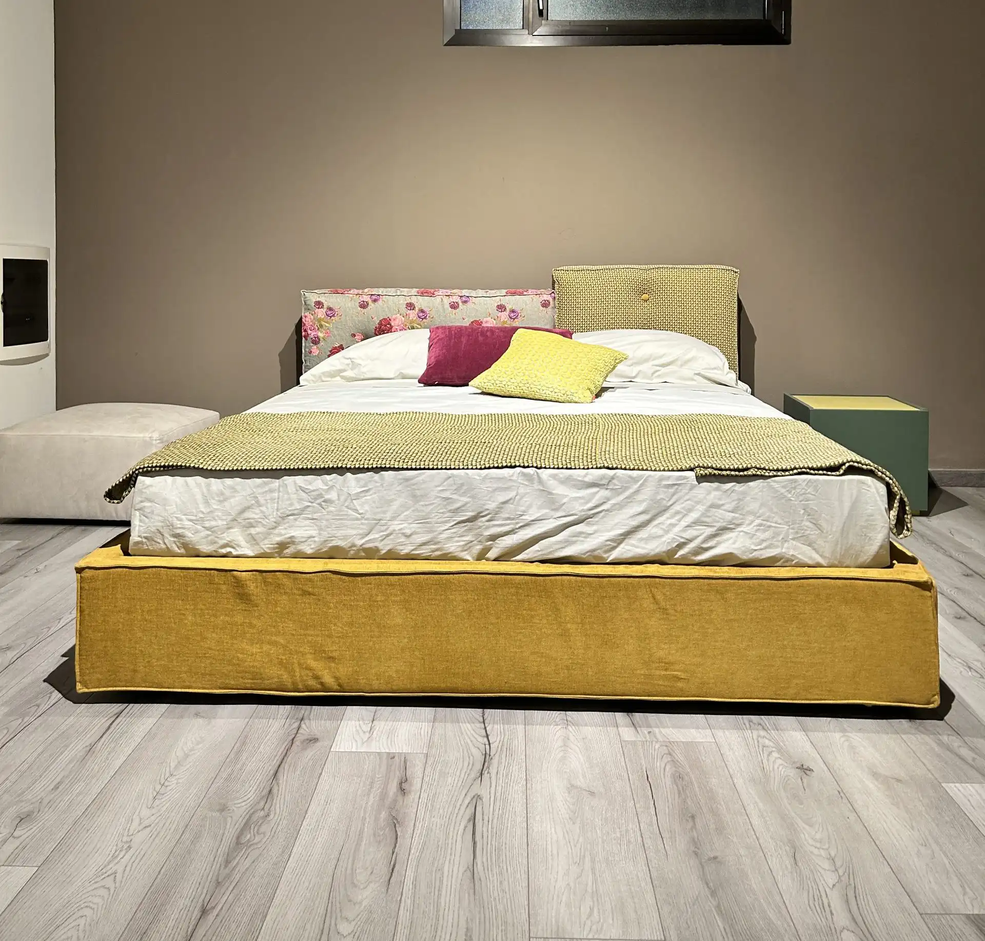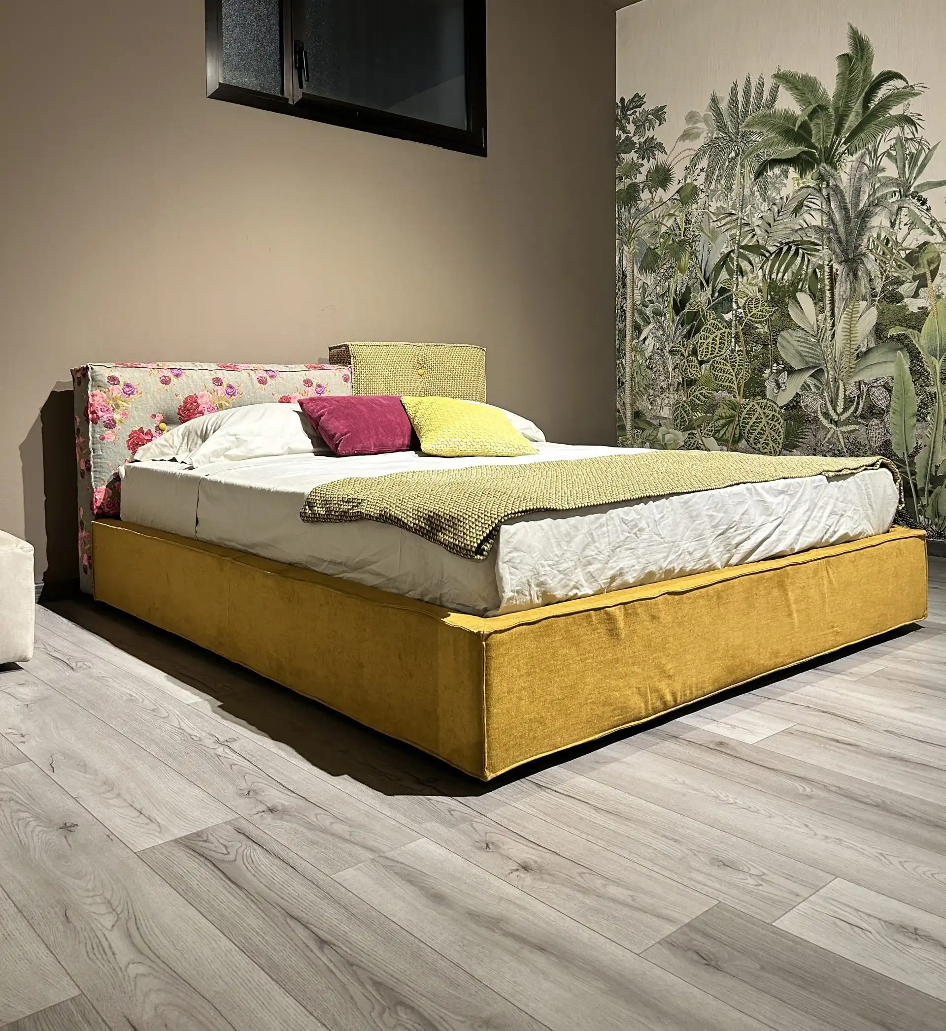 Letto matrimoniale L 185 X P 210 X H 92 con rete 170×200 cm, rivestito in tessuto.