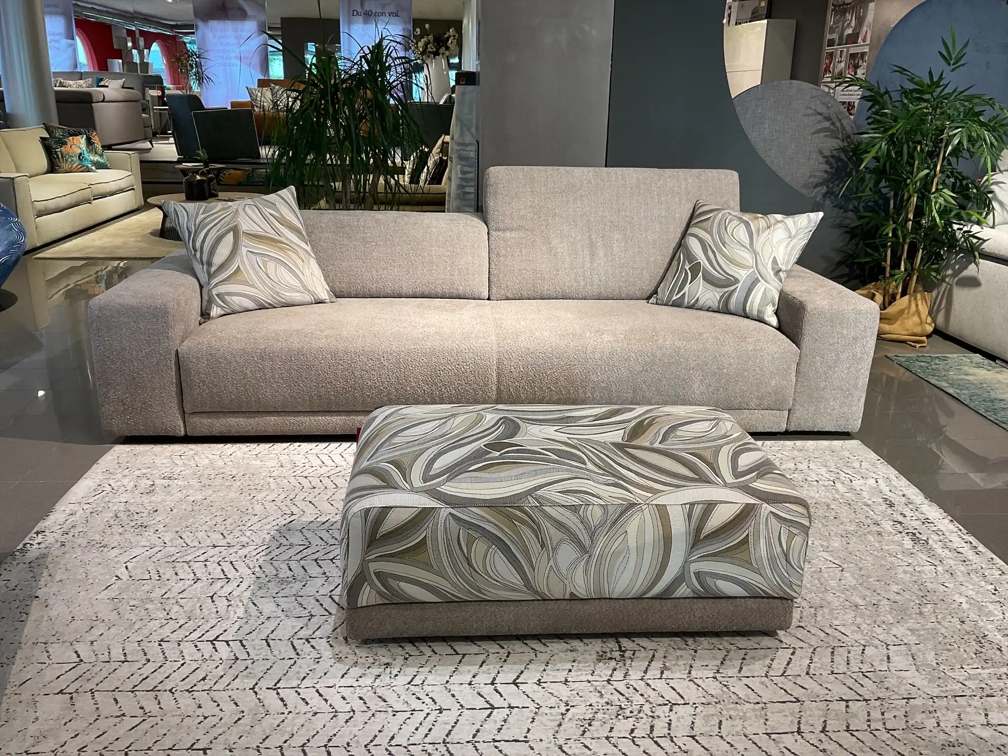 Divano 272×200 cm rivestito in tessuto lavabile antimacchia. Visibile nel negozio di Rosà.