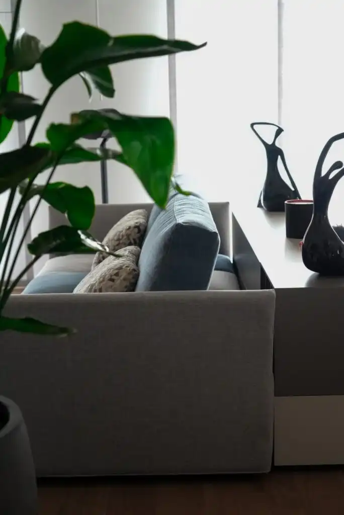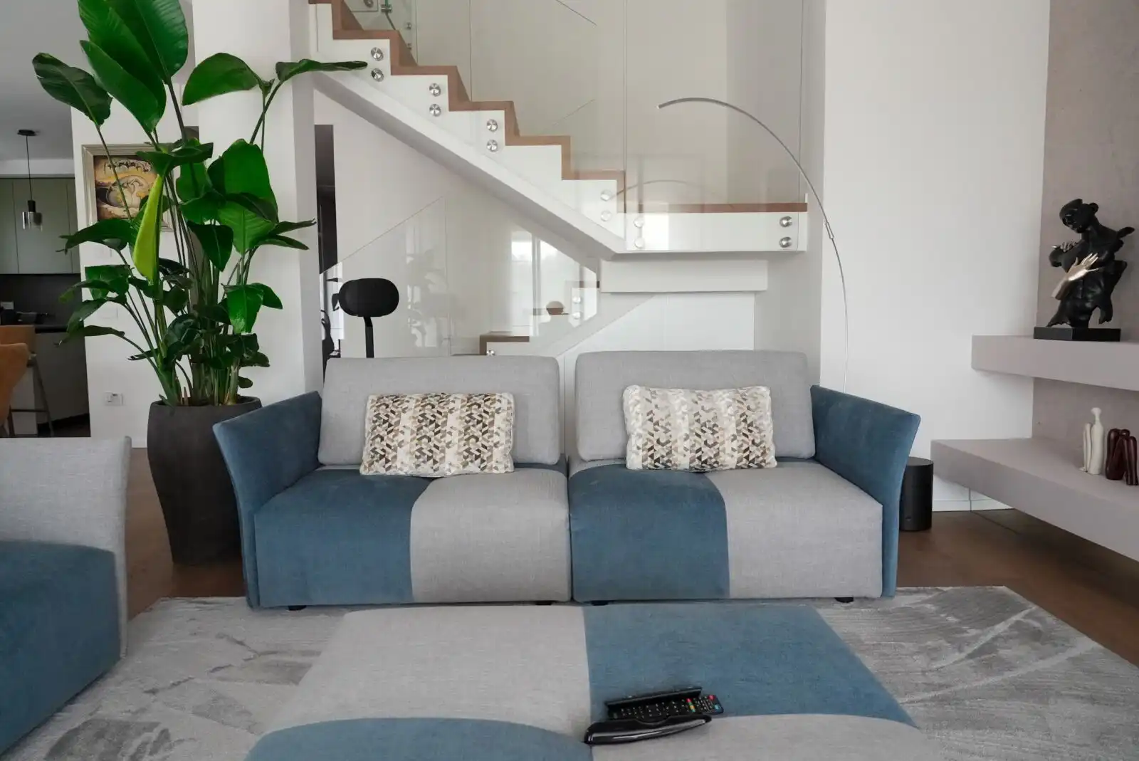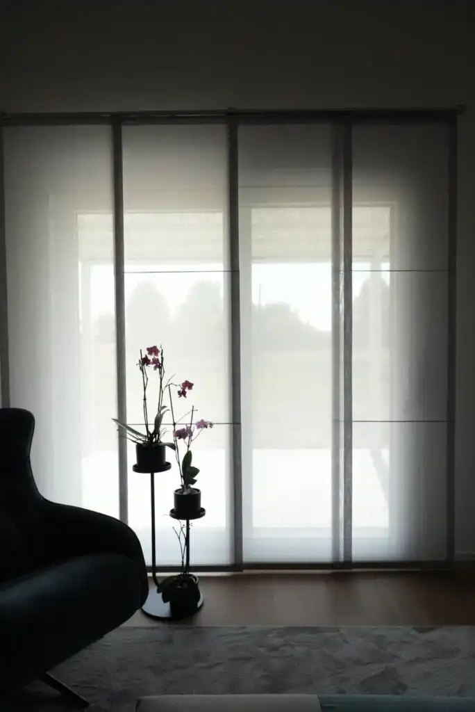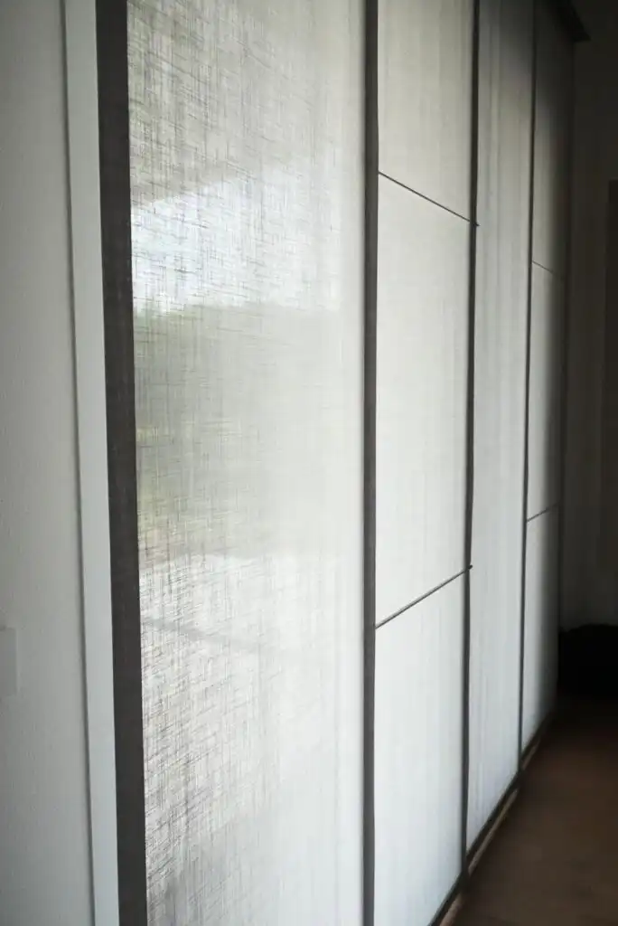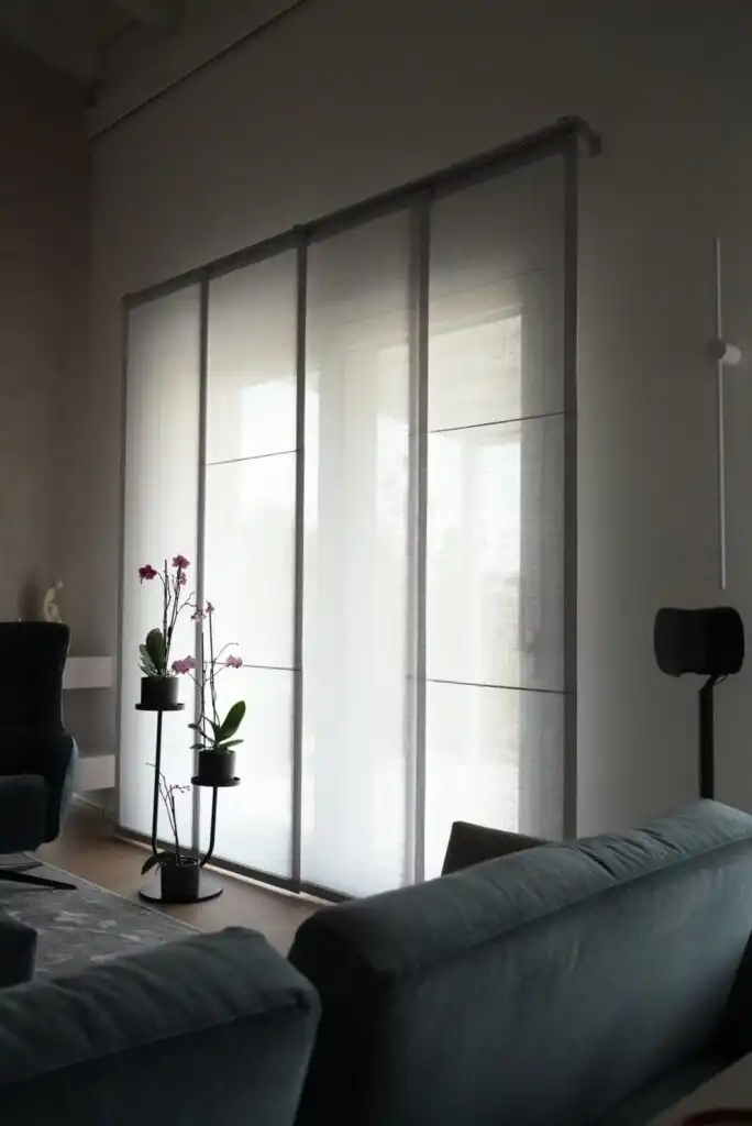 Il grigio perla del tappeto crea un elegante contrasto con il calore del pavimento in legno, mentre le tende a pannello steccato riprendono le geometrie della libreria in cartongesso.