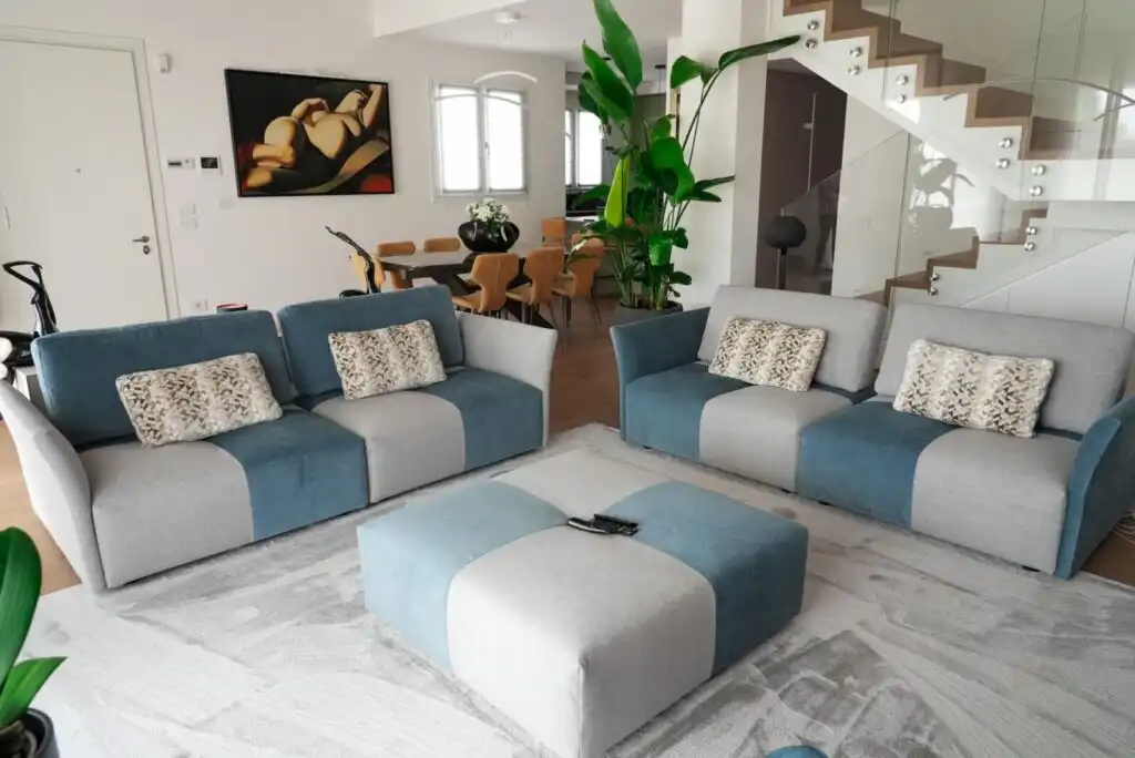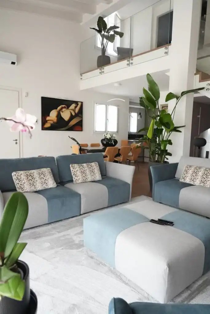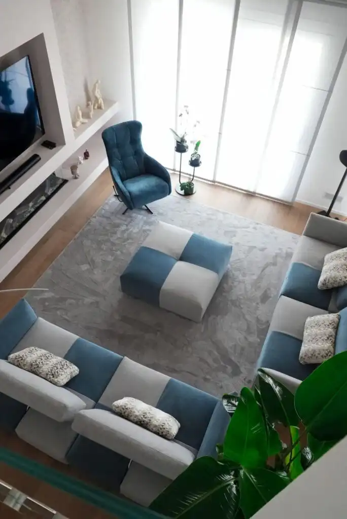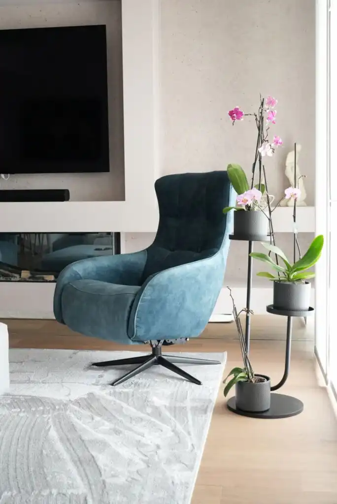 Colori e linee geometriche si rincorrono in un armonioso gioco di rimandi: l’azzurro avio che si alterna nella scacchiera del modello Tweet richiama la tonalità della poltrona girevole-relax Lidia.