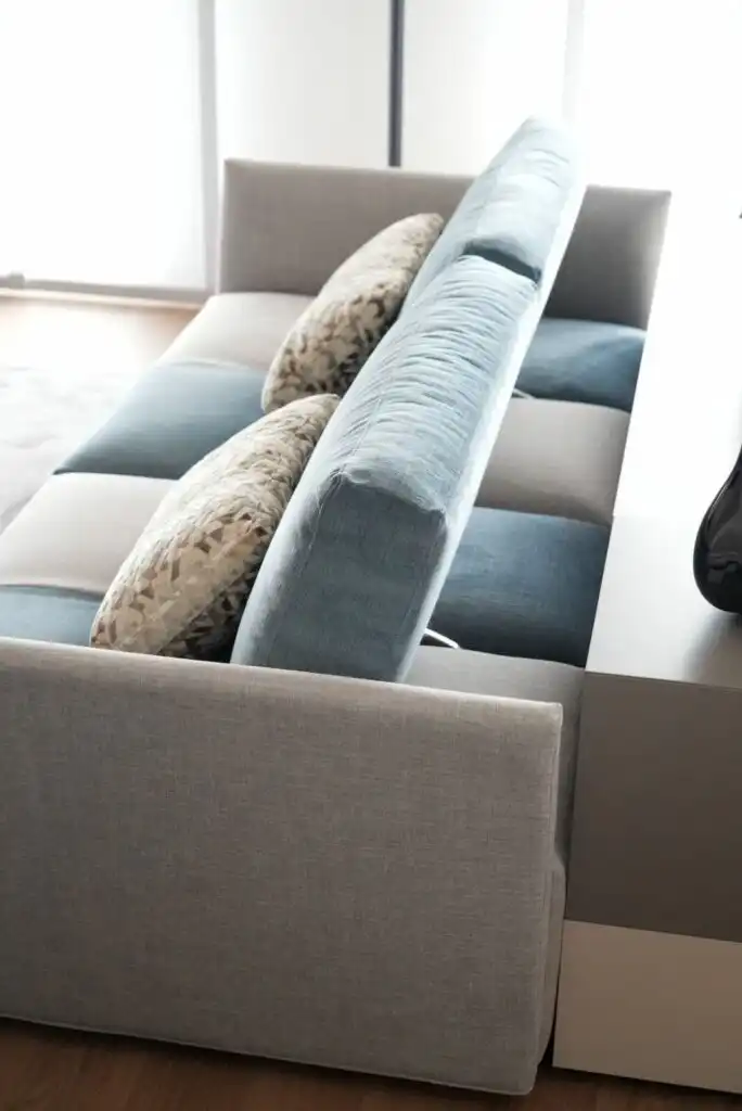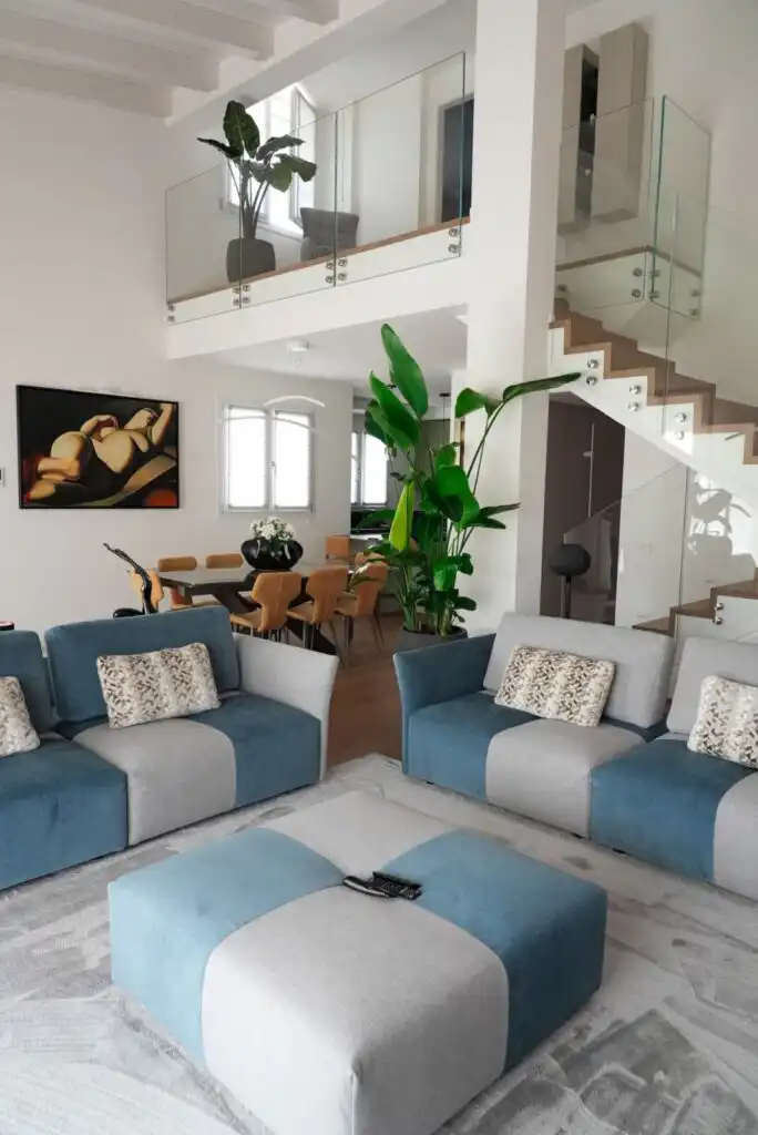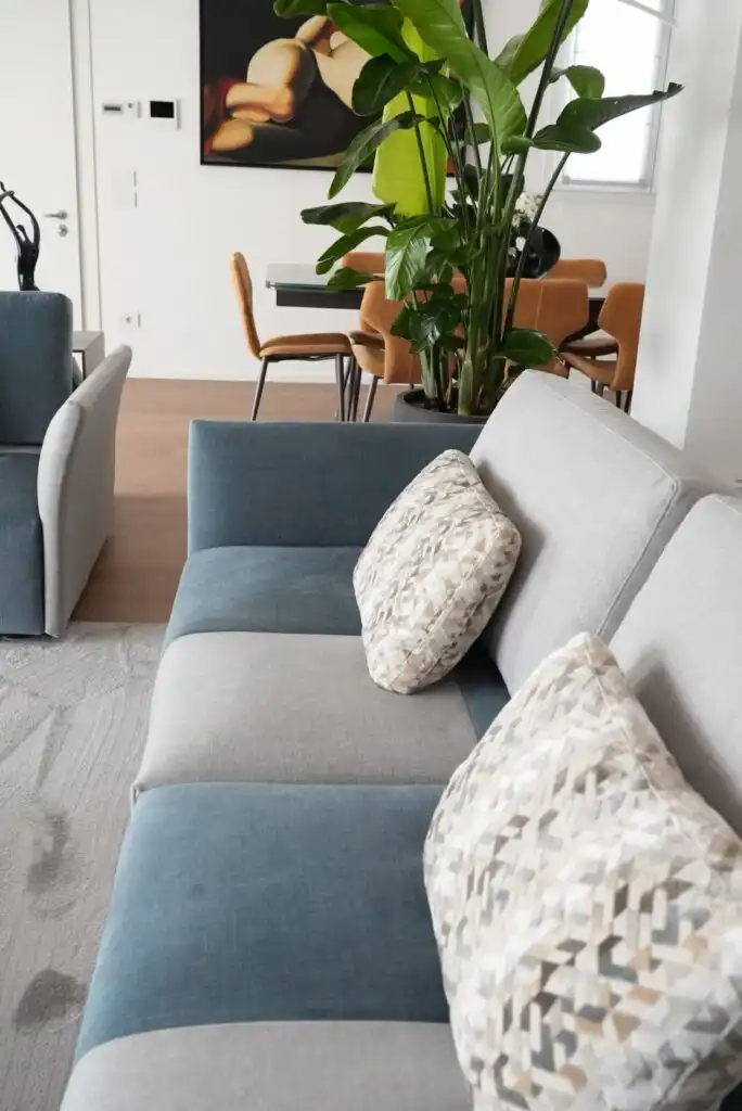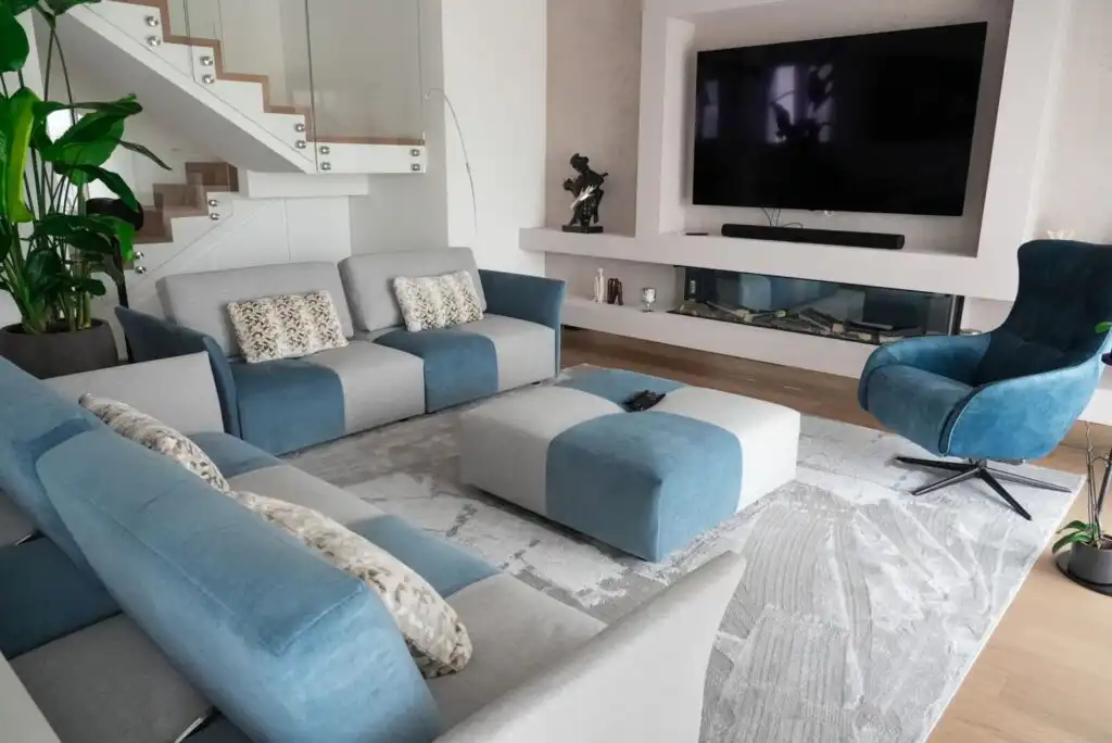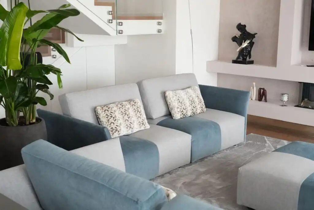 Colori e linee geometriche si rincorrono in un armonioso gioco di rimandi: l’azzurro avio che si alterna nella scacchiera del modello Tweet richiama la tonalità della poltrona girevole-relax Lidia.